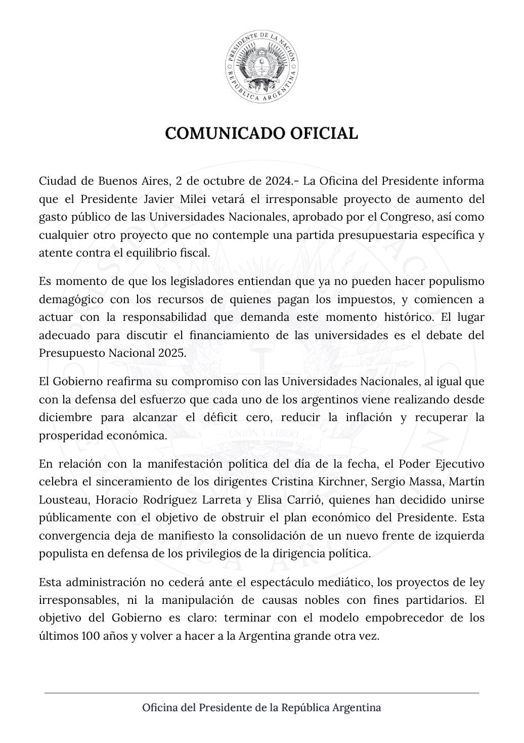 Previamente, un documento oficial en la cuenta del presidente Javier Milei anunciaba: “La Oficina del Presidente informa que el Presidente Javier Milei vetará el irresponsable proyecto de aumento del gasto público de las Universidades Nacionales, aprobado por el Congreso, así como cualquier otro proyecto que no contemple una partida presupuestaria especifica y atente contra el equilibrio fiscal”, comienza la misiva.