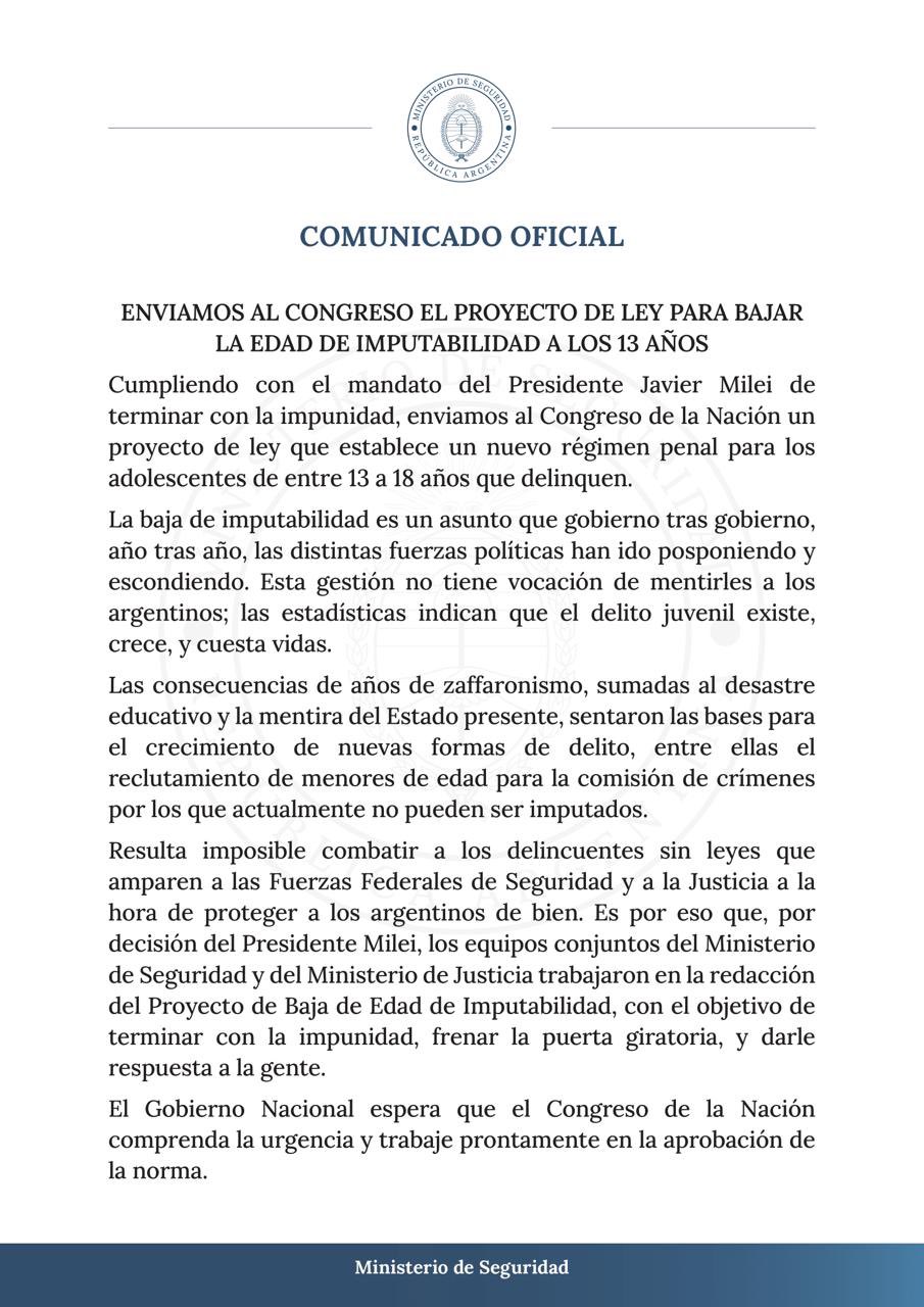 “Resulta imposible combatir a los delincuentes sin leyes que amparen a las Fuerzas Federales de Seguridad y a la Justicia a la hora de proteger a los argentinos de bien. Es por eso que, por decisión del Presidente Milei, los equipos conjuntos del Ministerio de Seguridad y del Ministerio de Justicia trabajaron en la redacción del proyecto de Baja de Edad de Imputabilidad, con el objetivo de terminar con la impunidad, frenar la puerta giratoria, y darle respuesta a la gente”, resaltó el oficialismo.