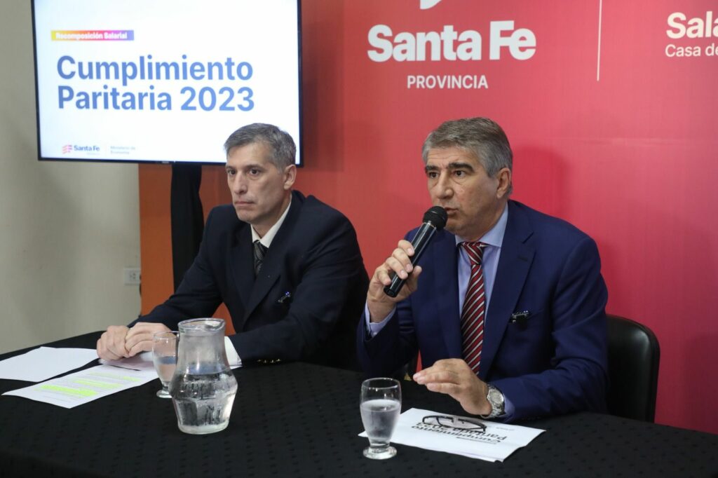 Las autoridades brindaron una conferencia de prensa en Casa de Gobierno donde ofrecieron detalles del esfuerzo económico que implica para el Estado afrontar este compromiso en un contexto de crisis: “Estamos cumpliendo con la Paritaria 2023 que alcanza un 215% de aumento -dijo Bastia-, siempre cumpliendo con nuestra palabra, que íbamos a hacerlo en base al aumento de ingresos de los recursos del Estado provincial”, y recordó que en diciembre “los recursos aumentaron el 14%, diferencia que ya fue abonada mediante planilla complementaria”.