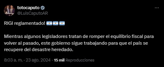 El Gobierno nacional oficializó este viernes la reglamentación del Régimen de Incentivo de las Grandes Inversiones (RIGI) en el Boletín Oficial. A través del decreto 749/2024, el Ejecutivo estableció los detalles del programa aprobado en agosto bajo la Ley Bases y el paquete fiscal. La noticia la informó Luis Caputo, ministro de Economía de la Nación, en su cuenta de Twitter.
