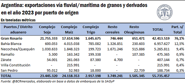 Desde el Gran Rosario salió en 2023 más del 75% del total de productos agroindustriales despachados desde puertos argentinos, mientras que el segundo lugar lo ocupó el puerto de Bahía Blanca con el 12,5%.