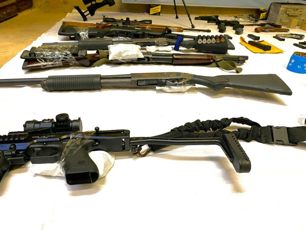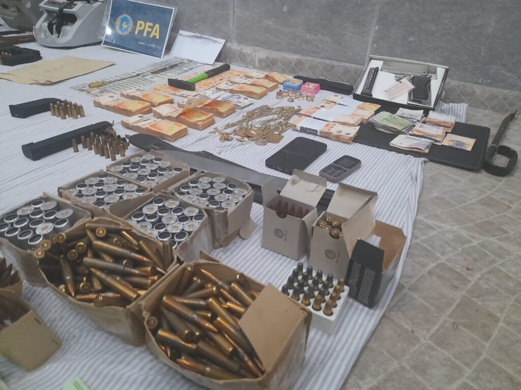 Se realizaron 8 allanamientos simultáneos en los cuales los federales hallaron un verdadero arsenal de armas de fuego: dos pistolas 9mm, dos Bersa Cal 380, una Whalter Cal 4.5mm, dos Glock de 9 y 45 mm, una Bersa Cal 22mm, un revólver Cal 38, tres escopetas Cal 12/70, una carabina Ruger Cal 9mm y dos fusiles Mauser Cal 7.62 y Cal 7.65 de alto alcance.