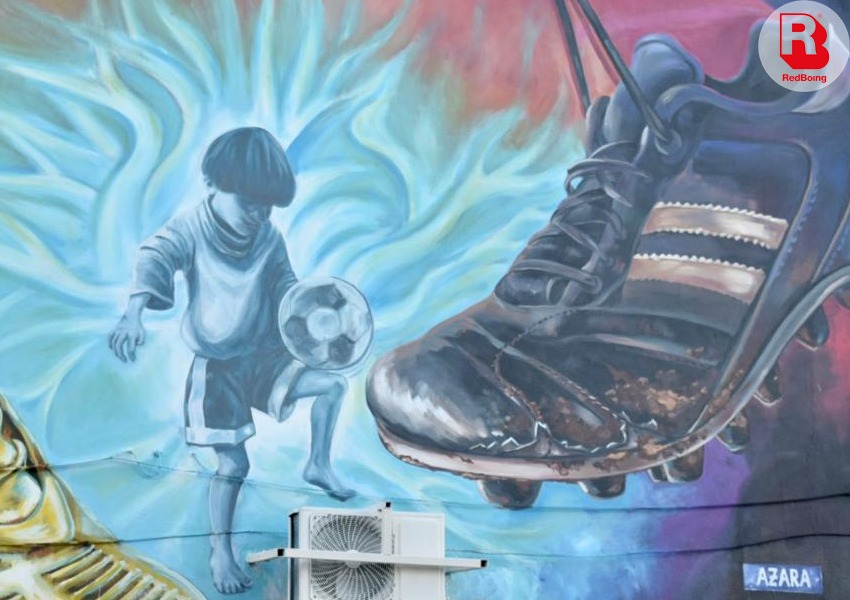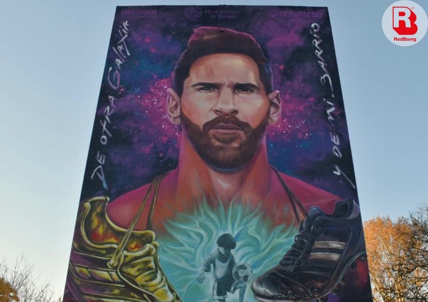 La gigantesca obra de arte muestra a la Pulga sin camiseta, con la mirada perdida en el horizonte y dos botines colgados del cuello. Uno de ellos está lleno de tierra, mientras que el otro brilla por imitar a la “Bota de oro”, premio que se le entregó seis veces por ser el jugador que más goles convirtió.