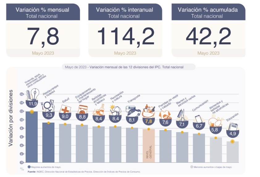 Según el Instituto Nacional de Estadísticas y Censos (INDEC), los precios al consumidor (IPC) aumentaron 7,8% en mayo de 2023 respecto de abril y acumulan el 114,2% de variación interanual y un alza de 42,2% en los primeros cinco meses del año.