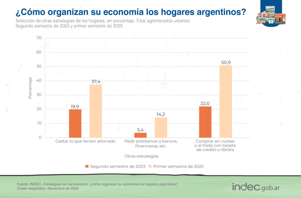 “El 19,9% de los hogares recurrió al uso de ahorros en 2003, mientras que en 2025 ese valor escaló al 37,4%. Entre las estrategias de financiamiento, los préstamos de bancos y financieras se incrementaron 10,8 puntos porcentuales y el uso de tarjeta de crédito o pago en fiado tuvo un aumento de 28,9 puntos porcentuales entre 2003 y 2025”, indicó el Indec.