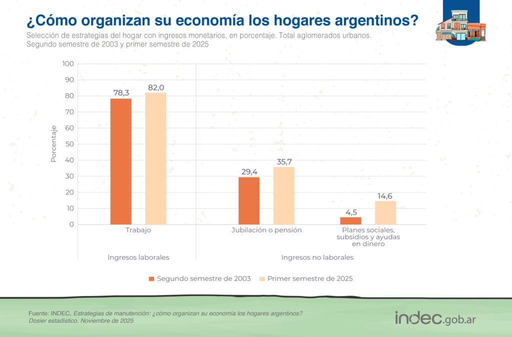 Un informe del Instituto Nacional de Estadística y Censos (Indec) reveló que la mitad de los hogares en Argentina utiliza distintas estrategias complementarias a sus ingresos monetarios para cubrir gastos cotidianos. El dosier “Estrategias de manutención: ¿cómo organizan su economía los hogares argentinos?” refleja que, ante ingresos que no acompañan el crecimiento de los costos de vida, las familias recurren cada vez más al uso de ahorros, préstamos y mecanismos de financiación.
