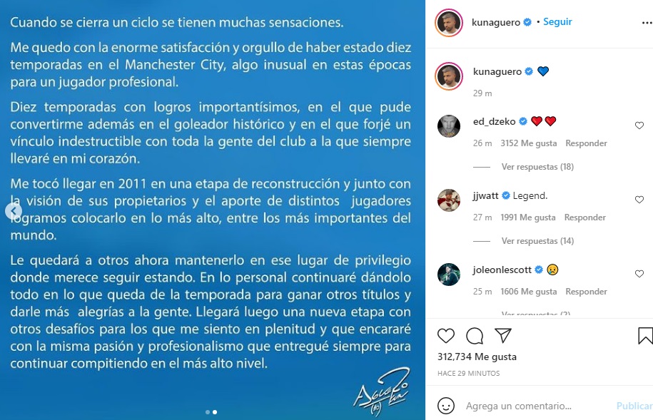 “Cuando se cierra un ciclo se tienen muchas sensaciones. Me quedo con la enorme satisfacción y orgullo de haber estado diez temporadas en el Manchester City, algo inusual en estas épocas para un jugador profesional”, escribió el Kun.