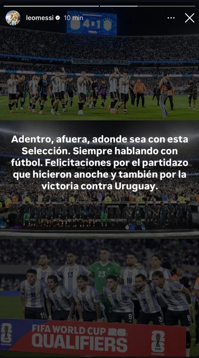 La “Pulga” compartió este miércoles por la mañana una historia de Instagram en la que destacó: “Adentro, afuera, a donde sea con esta Selección. Siempre hablando con fútbol”. Además, aprovechó para felicitar a sus compañeros “por el partidazo que hicieron anoche y también por la victoria contra Uruguay”.