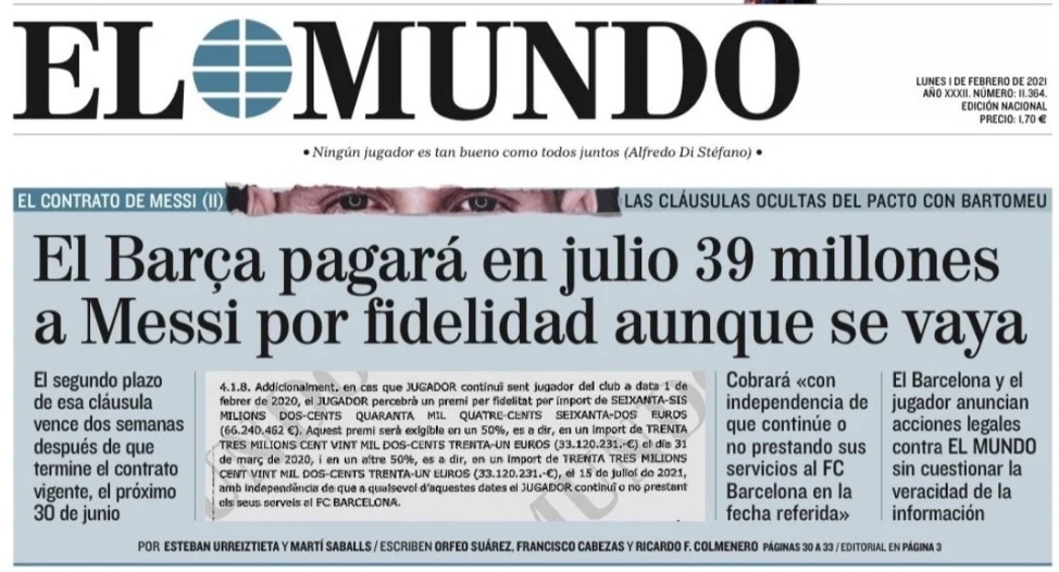 “El Barsa pagará en julio 39 millones a Messi por fidelidad aunque se vaya”, es el título de la edición del lunes 1 de febrero.