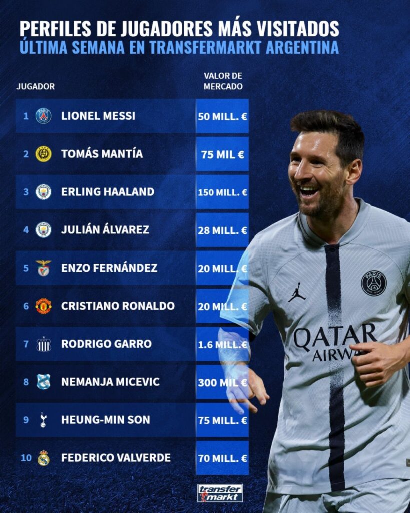 La lista de los diez jugadores más solicitados en las redes se completa con Cristiano Ronaldo, Rodrigo Garro (de Talleres de Córdoba), Nemanja Micevic, Heung-Min Son y el uruguayo Federico Valverde.