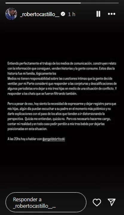 “Por mi parte consideré que responder a las conjeturas y descalificaciones de algunos periodistas era dejar a mis tres hijas en medio de una situación de conflicto. Y responder a los chats que se fueron filtrando también. Pero a pesar de eso, hoy siento la necesidad de expresarme y dejar registro para que mis hijas algún día puedan escuchar a su padre en el momento más polémico y no darle explicaciones con el paso de los años, que tienden a ir distorsionando la perspectiva. Quizás me entiendan, quizás no. Pero es necesario hacerme cargo, contar mi realidad y en todo caso pedir perdón a mis tres bebés posicionadas en esta situación”, concluyó.