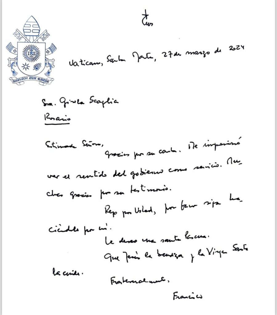 El mismo miércoles a la noche, la vicegobernadora recibió una respuesta escrita de puño y letra por el Papa, que comienza agradeciendo y agrega: “Me impresionó en el sentido del gobierno como servicio”. “Rezo por usted, le pido que lo siga haciendo por mí”, dice en otro tramo la carta del Sumo Pontífice.