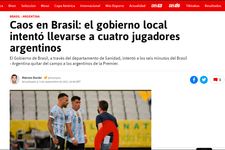 Por otro lado, Diario As también se hizo eco de lo ocurrido en el vecino país y expresó: “Caos en Brasil: el gobierno local intentó llevarse cuatro jugadores argentinos” y “El bochornoso momento que paralizó el partido entre Brasil y Argentina”.