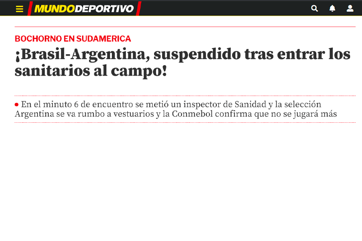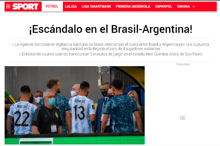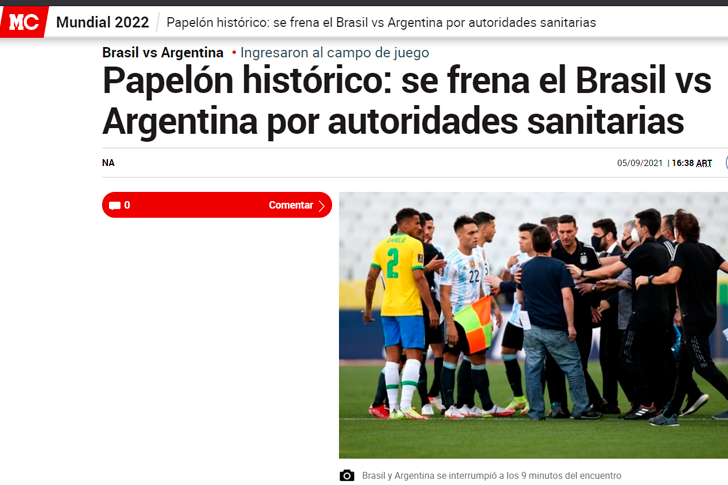 Por ejemplo, el diario Marca de España tituló la nota diciendo: “Papelón histórico: se frena el Brasil – Argentina por autoridades sanitarias”.
