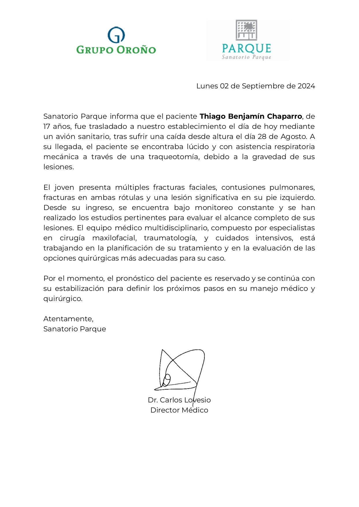 Este lunes arribó a la ciudad el adolescente rosarino Thiago Benjamín Chaparro, quien días atrás sufrió una caída desde un sexto piso de un hotel en el marco de su viaje de egresados. El parte médico informado por el Sanatorio Parque indicó que el joven estudiante ingresó al nosocomio de manera lucida, pero con asistencia respiratoria mecánica. El cuadro del paciente, es reservado ya que presenta múltiples fracturas.