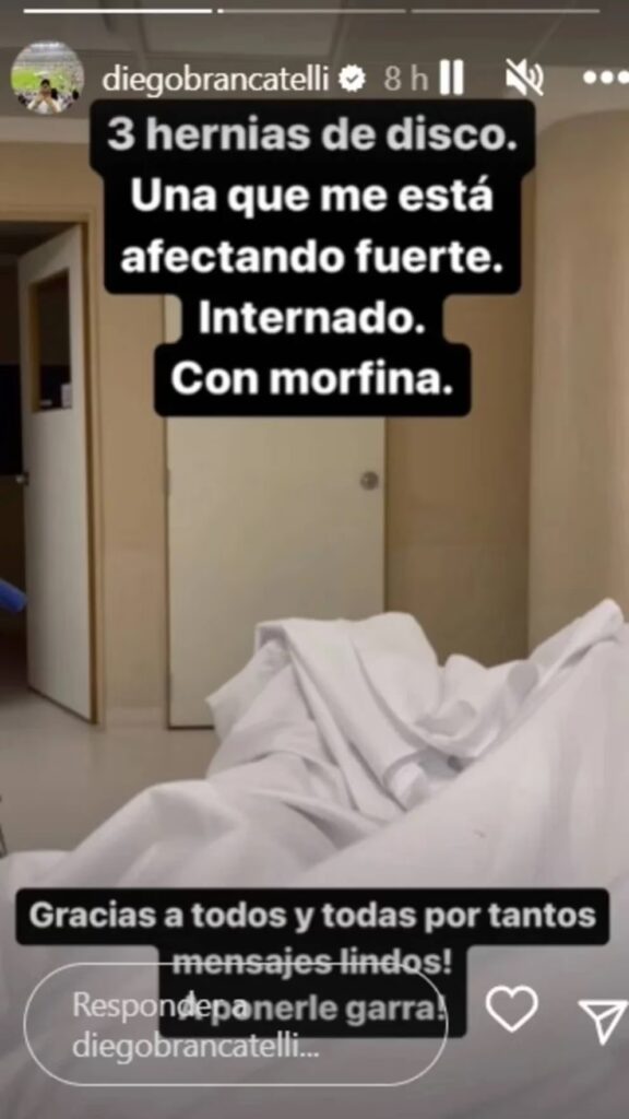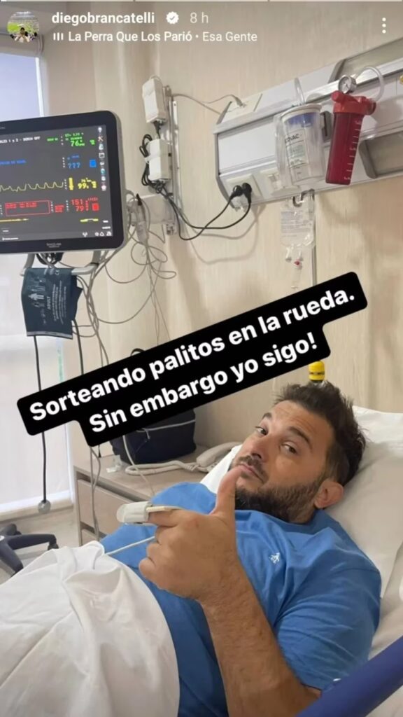“Sorteando palitos en la rueda. Sin embargo yo sigo”, escribió el periodista Diego Brancatelli como texto en una foto publicada en su cuenta de Instagram. En la foto, se lo veía con un pulgar arriba desde una cama hospitalaria. La story fue subida ayer, acompañada de dos imágenes más, que explicaban su complicado parte médico: “Tres hernias de disco. Una que me está afectando fuerte. Internado. Con morfina”, agregó.