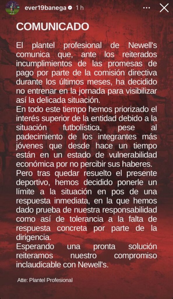 Los jugadores de Newell’s Old Boys emitieron este martes un comunicado en el que explicaron los motivos de la medida de fuerza que llevaron adelante al no presentarse a entrenar. Según lo expresado en el mensaje difundido por el plantel —y compartido por el capitán Éver Banega— el reclamo surge por un retraso salarial que se arrastra desde el mes de agosto.