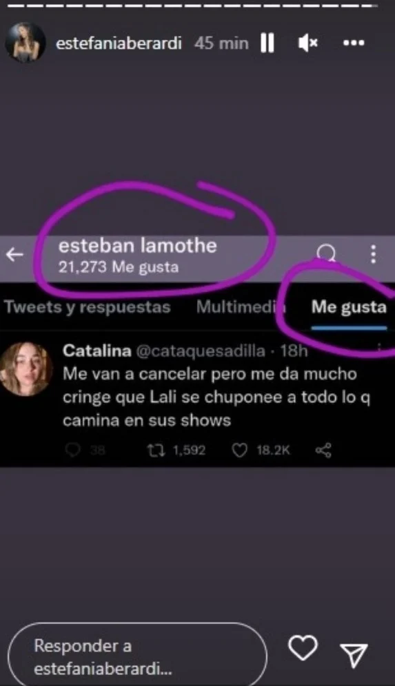 “Me van a cancelar, pero me da mucho cringe que Lali se chuponee a todo lo que camina en sus shows”, fue el tweet al que Esteban le dio like, y que Estefi Berardi logró capturar.