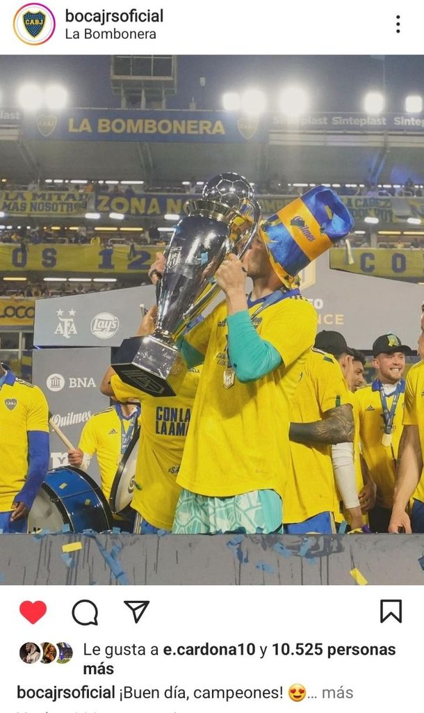 La foto fue publicada por la cuenta oficial de Boca en Integraran donde aparece Agustín Rossi besando la copa. El colombiano, sin continuidad en Racing por sus acciones afuera del campo, reaccionó al posteo de Boca con un “Me gusta”. Su like fue criticado con dureza por los hinchas de Racing a horas de perder el campeonato.