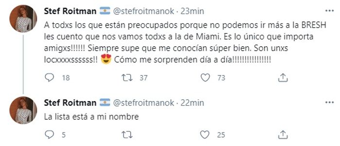 “A todxs los que están preocupados porque no podemos ir más a la BRESH les cuento que nos vamos todxs a la de Miami. Es lo único que importa amigxs!!!!!! Siempre supe que me conocían súper bien. Son unxs locxxxxssssss!! Cara sonriente con ojos en forma de corazón Cómo me sorprenden día a día!!!!!!!!!!!!!!!!”, escribió la novia de Ricky Montaner. Y luego indicó: “La lista está a mi nombre”.
