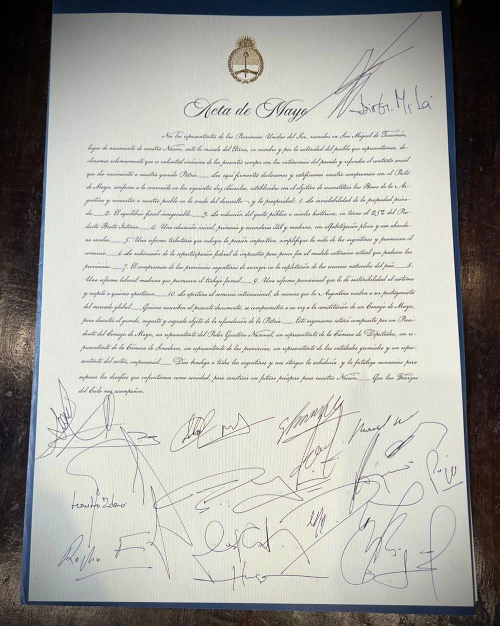 El presidente, Javier Milei, firmó junto a los gobernadores de las provincias argentinas presentes el acta del Pacto de Mayo. Luego de entonar el Himno Nacional, el mandatario y los gobernadores ingresaron a la Casa Histórica de Tucumán, para firmar uno a uno el compromiso de 10 puntos acordado.