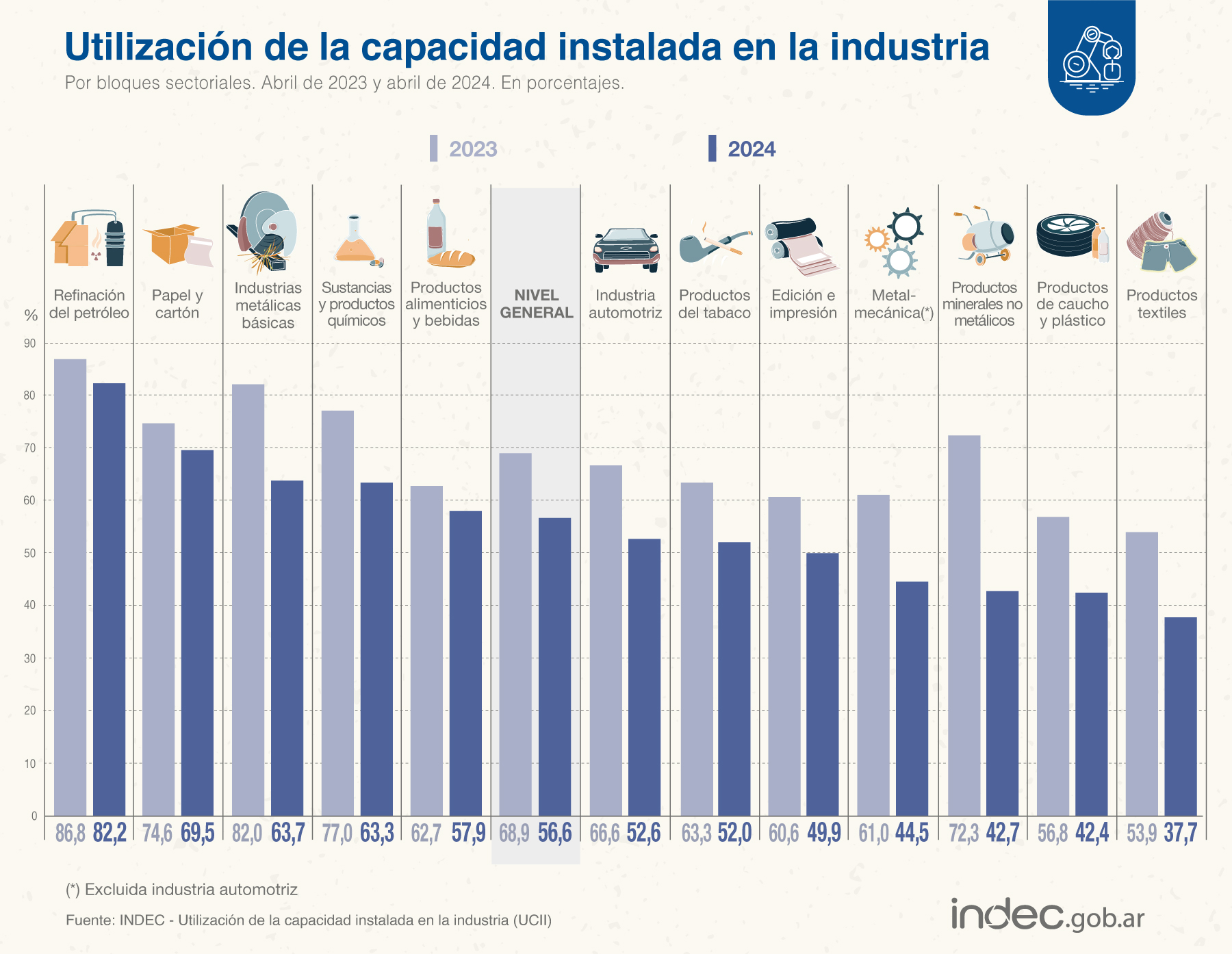 Los bloques sectoriales que se ubican debajo del nivel general son industria automotriz (52,6%), productos del tabaco (52,0%), edición e impresión (49,9%), metalmecánica excepto automotores (44,5%), productos minerales no metálicos (42,7%), productos de caucho y plástico (42,4%) y productos textiles (37,7%).