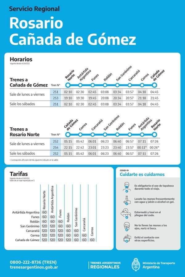 Por su parte, de lunes a viernes el servicio saldrá desde la Estación Cañada de Gómez a las 5:15 y a las 22:15 y arribará a Rosario a las 7:26 horas y a las 00:26, respectivamente. En tanto, los sábados habrá un servicio desde el Departamento Iriondo que se pondrá en marcha a las 5:15 horas.