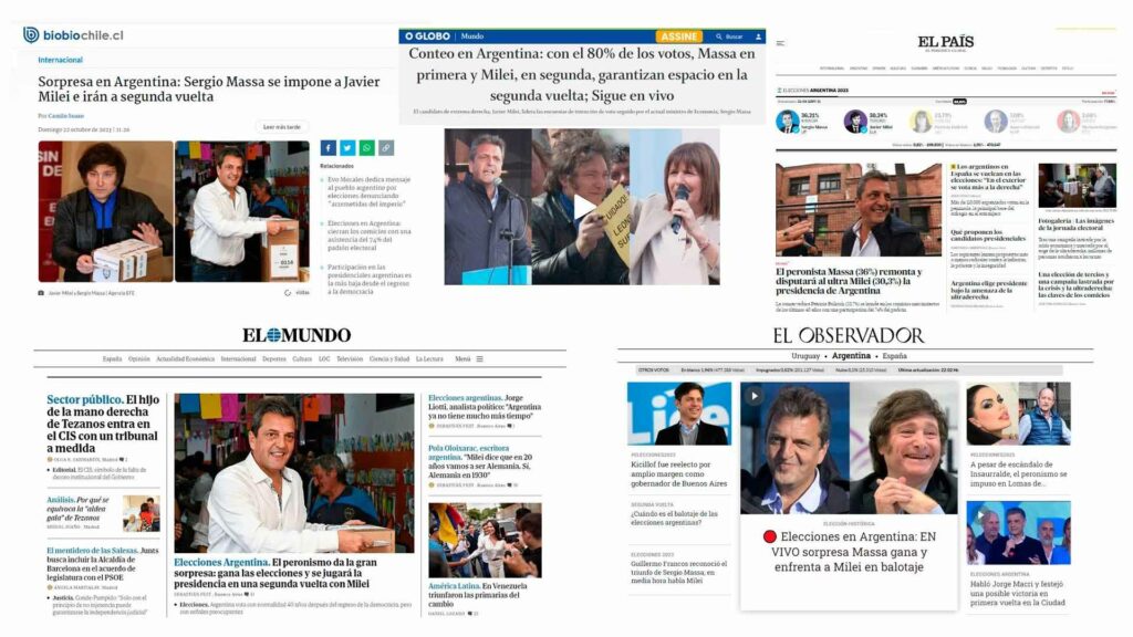 El portal chileno Biobio enfatizó en “sorpresivo” el resultado de la primera vuelta. “La mayoría de las encuestas pronosticaban una victoria de Milei, quien ya se había impuesto en las primarias PASO (elecciones primarias abiertas simultáneas y obligatorias)”.