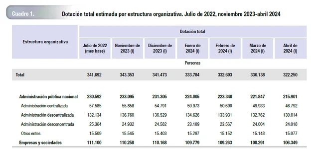 En empresas y sociedad del Estado, había 110.168 personas trabajando en diciembre de 2023, y a abril había disminuido a 106.349, lo cual también refleja un recorte, de casi 4.000 empleados.