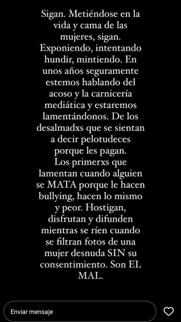 “Sigan. Metiéndose en la vida y cama de las mujeres, sigan. Exponiendo, intentando, hundir, mintiendo. En unos años seguramente estemos hablando del acoso y la carnicería mediática, y estaremos lamentándonos”.