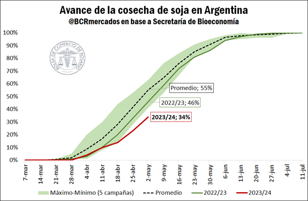 Los últimos datos oficiales indican que al 24 de abril la industria y la exportación realizaron compras por 13,6 Mt de soja, esto es, apenas el 27% de una cosecha estimada de 50 Mt, cuando el promedio de los últimos cinco años muestra que para esta misma fecha el porcentaje de compras asciende al 34%.