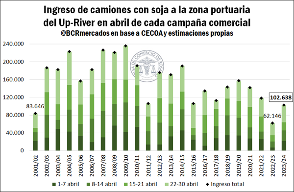 En este contexto, el ritmo en el ingreso de camiones con soja a las terminales portuarias del Up-River se mostró acotado. Se estima que en abril se descargaron apenas 3,1 Mt de soja en las terminales del Gran Rosario, el segundo volumen más bajo en los últimos 22 años, desde la campaña 2001/02.