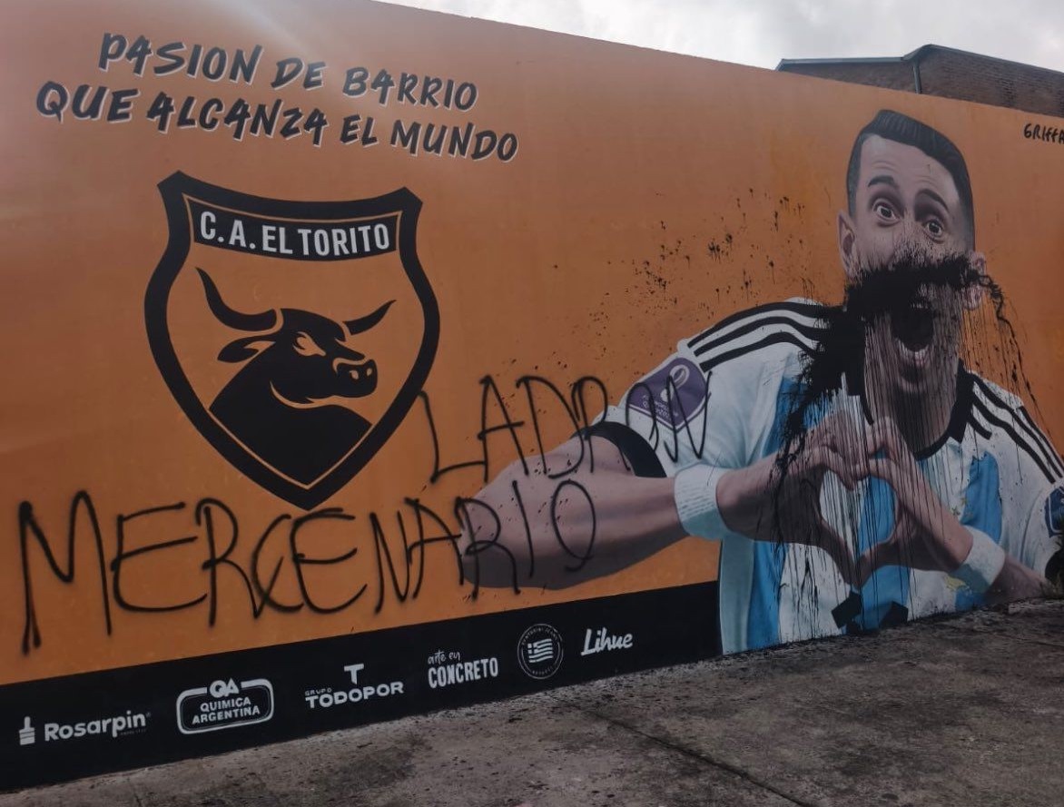 En El Torito, Di María jugó sus primeros partidos de chico antes de pasar a las categorías menores de Rosario Central, que pagó con pelotas de fútbol su pase. En 2024, después de un partido del canalla por la Copa Libertadores, el mural ya había sido atacado. Esta vez, alguien tiró pintura sobre la cara de “Fideo” y dejó mensajes agresivos.