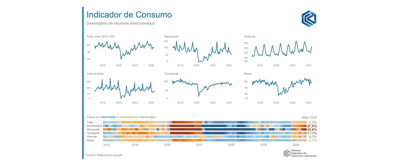 El consumo tuvo con una caída del 7,7% en mayo último, según el indicador elaborado por la Cámara de Comercio y Servicios (CAC). Los rubros más castigados son Recreación y cultura (-42,6%) e Indumentaria y calzado (-27%) fueron los rubros más afectados.