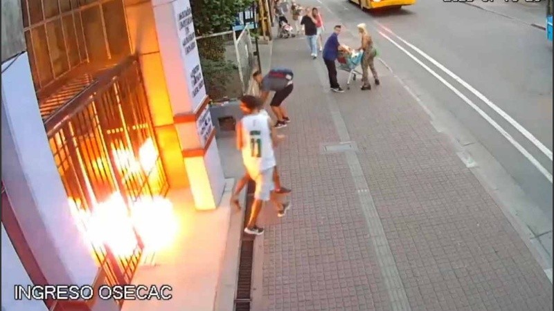 La cámara de seguridad de la obra social de Empleados de Comercio, el lugar que fue atacado en Corrientes al 400, registró la imagen de dos jóvenes que se acercaban caminando poco antes de las ocho de la noche del martes 17, para arrojar primero un líquido inflamable y luego encender el fuego, ante la atónita mirada de varios transeúntes ocasionales. En ese video, se los veía llegar y salir caminando. No obstante, testigos que aportaron a la investigación que lleva adelante Schiappa Pietra señalaron que de ahí se habían ido “en un auto rojo de marca Toyota”.