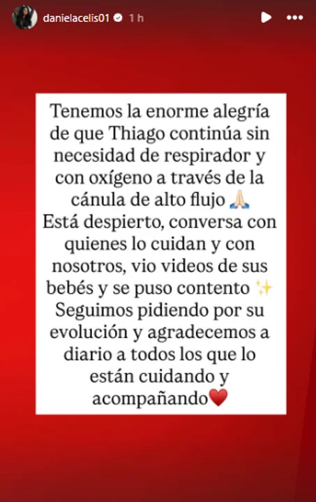 Seguido, compartió el estado de salud de Medina: “Tenemos la enorme alegría de que Thiago continúa sin necesidad de respirador y con oxígeno a través de la cánula de alto flujo. Está despierto, conversa con quienes lo cuidan y con nosotros”.