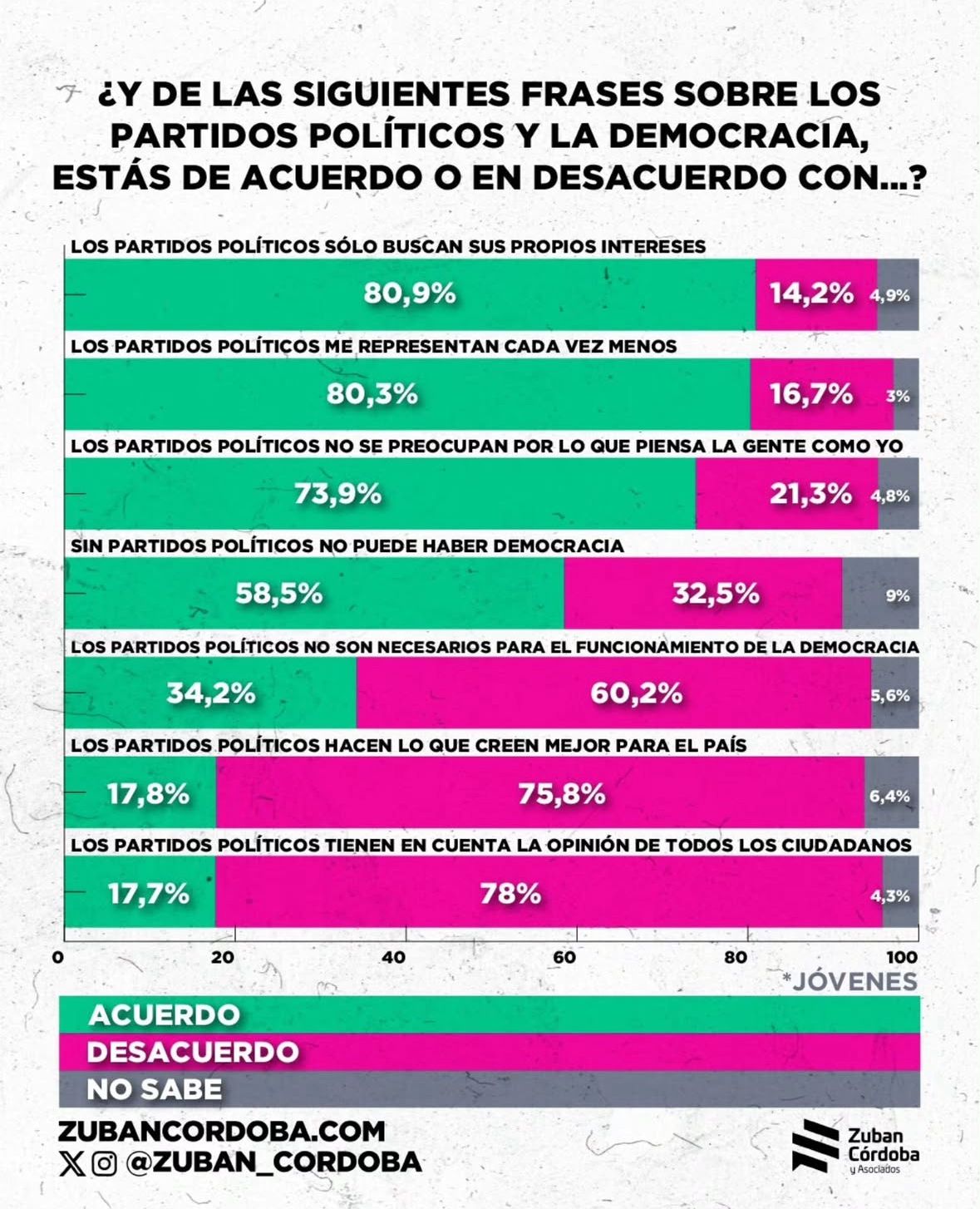 En charla con Todo Pasa, el analista detalló: “Los datos son de todo el país. El informe puso la lupa en jóvenes de 16 a 30 años. Cuando preguntamos por la diferencia entre libertarios y liberales, o si se identifican con el pensamiento ideológico, hoy mayoritariamente los jóvenes responden que se sienten más identificados con el pensamiento de derecha, que hace unos años quizás no pasaba. Cuando consultás qué espacio político es el que más representa a los jóvenes, la respuesta que ganó es ‘Nadie’ con el 34 por ciento. Y muy cerquita quedó La Libertad Avanza, con el 32 por ciento. Pero un tercio de los jóvenes no se siente representado por ningún partido”, dijo Córdoba Zuban.