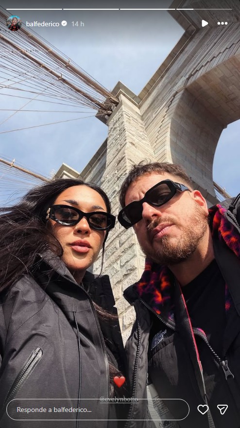 Luego de confirmar su romance, Evelyn Botto y Fede Bal decidieron viajar juntos a Nueva York y subir su primer foto como pareja en el Puente de Brooklyn. El hijo de Carmen Barbieri publicó en sus historias de Instagram este primer gesto romántico.