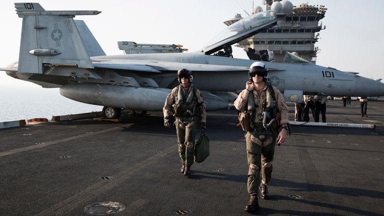 Pilotos de la Marina de la unidad “Red Rippers” VFA-11 en el portaaviones Theodore Roosevelt en 2015. Integrantes de ese escuadrón empezaron a ver objetos extraños después de la actualización de los sistemas de radar. (Adam Ferguson para The New York Times)
