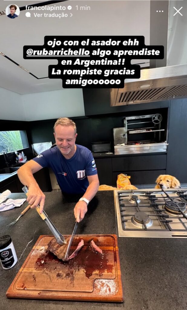 El piloto argentino, integrante de la academia Alpine, compartió en sus redes sociales imágenes del encuentro y destacó la calidez con la que fue recibido por el ex piloto de Ferrari y Williams, entre otros. “Ojo con el asador ehh..”, escribió Colapinto, acompañando la publicación con una foto junto a Barrichello y un tradicional asado preparado por el propio anfitrión.