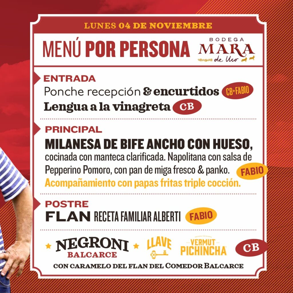 La propuesta en esta oportunidad, para el 4 de noviembre, es que el conocido humorista y actor Fabio Alberti, luzca sus dotes de cocinero. Que junto al equipo del Balcarce prepare la cena para los rosarinos que deseen pasar una gran velada, con sabores, anécdotas y un toque de humor. Por supuesto que Alberti será el anfitrión y pasará por las mesas para entablar un intercambio con los comensales. Un plan irrepetible.