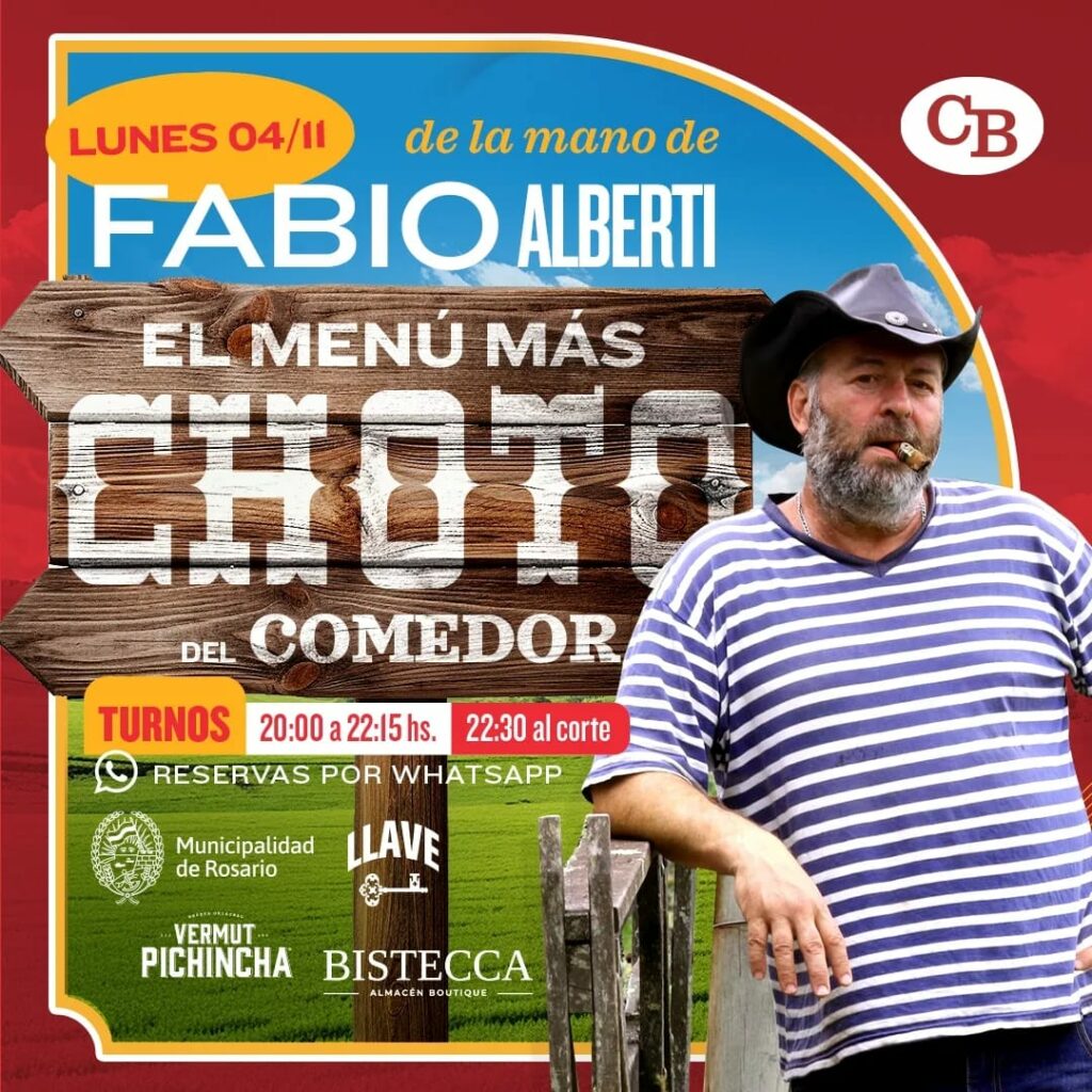 El famoso comediante y actor Fabio Alberti, conocido por sus trabajos en CHA CHA CHA Y Todo Por Dos Pesos y por sus personajes Coti Nosiglia y Boluda Total llega en noviembre a la ciudad, lo que despertará el interés de sus muchos seguidores. La gran sorpresa es que en ésta ocasión la convocatoria no será ni una obra de teatro ni un show de stand up. Alberti viene invitado por el mítico bodegón Comedor Balcarce para cocinarles a todos los rosarinos que concurran.