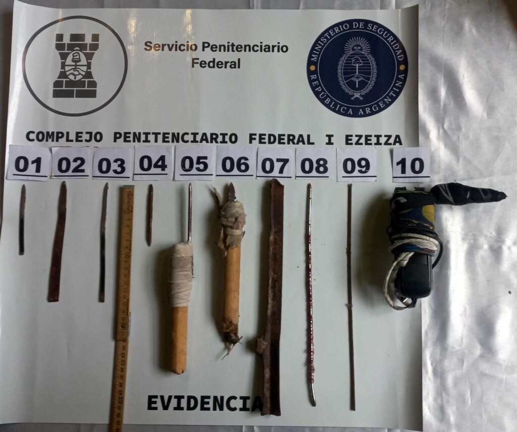 Un primer procedimiento realizado en el Complejo Penitenciario Federal I de Ezeiza, donde el personal del SPF secuestró, en dos pabellones del penal, un teléfono celular, cargador, una máquina tatuadora casera y 22 elementos de metal; todos estos no permitidos a los internos.