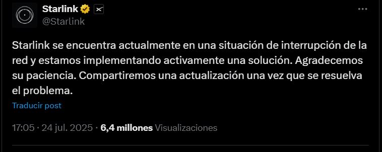 Desde la empresa de Elon Musk informaron a través de X: “Starlink se encuentra actualmente en una situación de interrupción de la red y estamos implementando activamente una solución”.