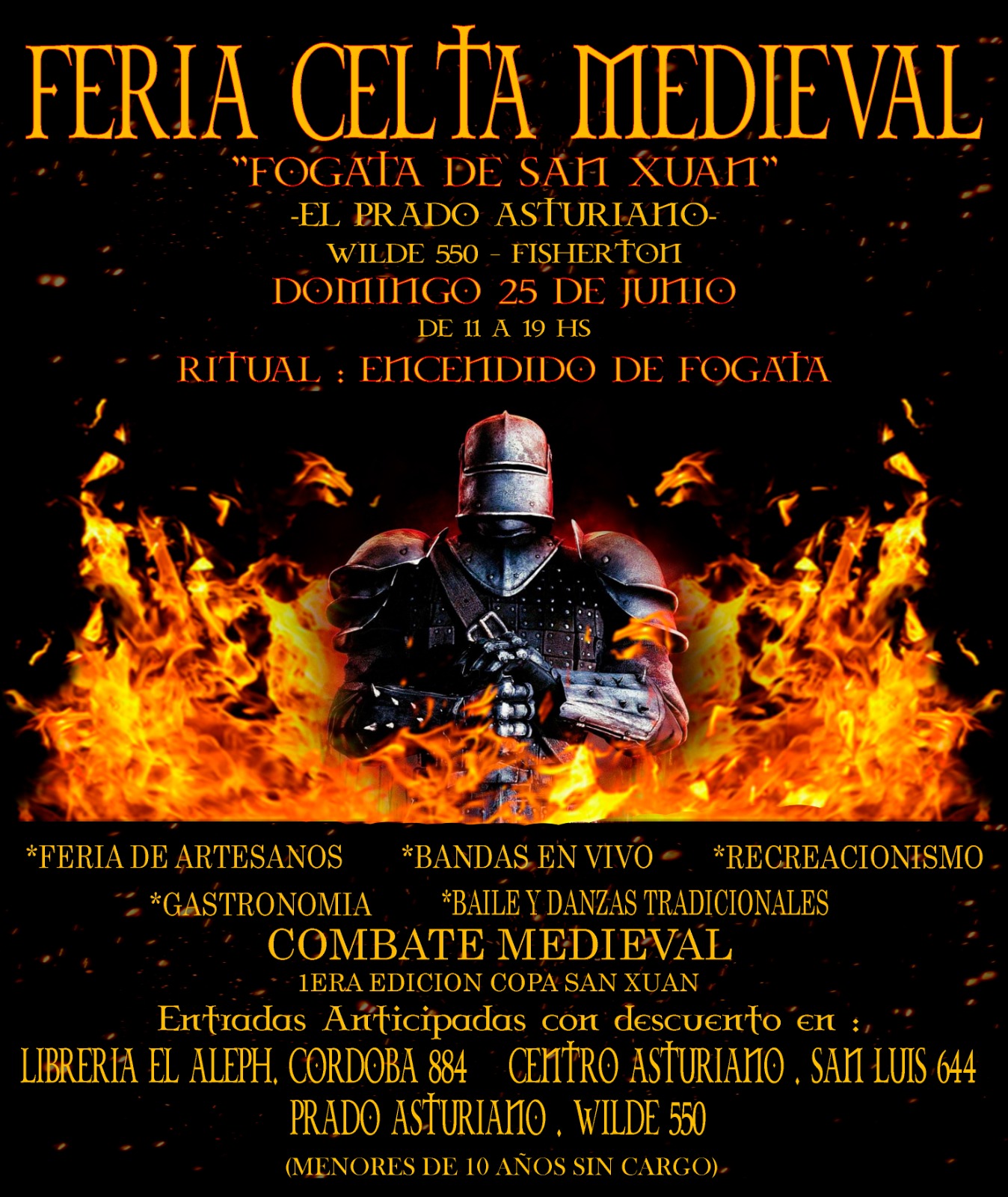 Al culminar la tarde y para dar un cierre con muchísima magia a este evento extraordinario, se realizará el encendido de la Gran Fogata de San Xuan… Gaitas y tambores sonarán, antorchas danzantes darán vueltas a su alrededor, encomendando los deseos de quienes deseen arrojarlos al fuego y finalmente la gran hoguera iluminarán la tarde noche de nuestra querida ciudad.