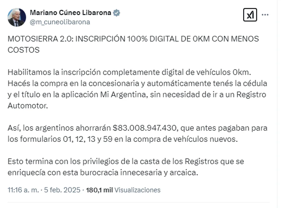 “Habilitamos la inscripción completamente digital de vehículos 0km”, anunció el ministro de Justicia, Mariano Cúneo Libarona.