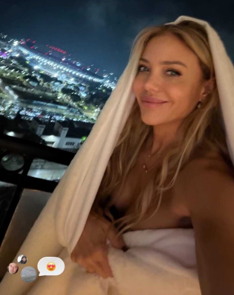 Todo ocurrió cuando la modelo decidió disfrutar del cierre del recital desde su hogar y compartió una postal en la que aparece envuelta en una manta, lo que llevó a muchos usuarios a creer que estaba completamente desnuda. Sin embargo, minutos después aclaró que se trataba de una puesta en escena.