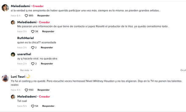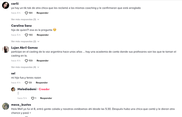 Sus dichos tuvieron mucho eco en las redes sociales, donde muchos ex participantes del casting de La Voz Argentina confirmaron la denuncia. “Dos segundos te dejaban cantar”, contó y luego relató lo que pasó con otra aspirante, a la que dejaron cantar todo un tema: “En ese momento dije ‘esta chica está acomodada’ y después la veo en La Voz Argentina, una vergüenza, es indignante“.