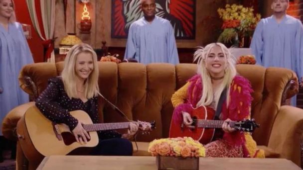 Con un estilo bastante noventero que incluyó un brillante abrigo rojo con amarillo, un top blanco y unos leggins rojos con blanco, Gaga sorprendió a Phoebe durante su desafinado cantar. “Es extraño, estaba caminando por la calle y resulta que tengo mi guitarra”, expresó la cantante mientras mostraba su instrumento rojo.