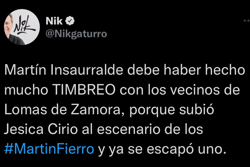 En el tweet, Nik había expresado: “Martín Insaurralde debe haber hecho mucho TIMBREO con los vecinos de Lomas de Zamora, porque subió Jésica Ciro al escenario de los Martín Fierro y se le escapó uno”.